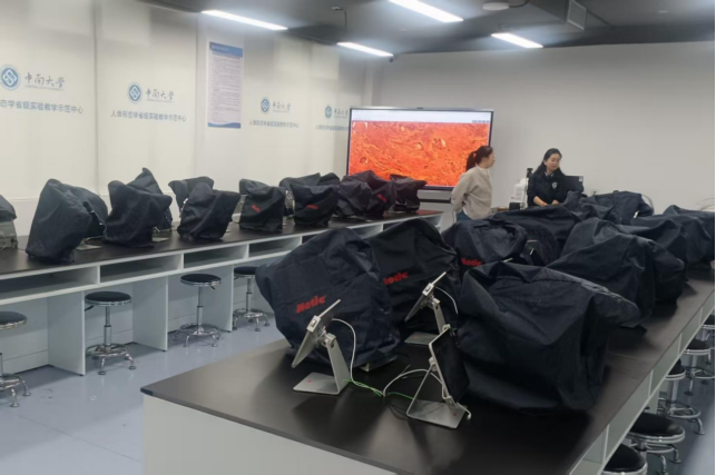 团队重点考察了湘雅医学院显微、解剖、人体机能学实验室以及长沙民政职业技术学院的智能化基础医学实验室。湘雅医学院显微实验室作为智能无线互动教室,在智能化互动场景体验、多方位教学反馈、定制化桌台布局及局域无线网建设等方面展现了高标准的建设理念。解剖实验室采用了“数字+实体解剖”的教学模式,结合数字虚拟仿真系统,实现了传统教学与现代科技的深度融合。人体机能学实验室通过多样化实验套装与智能化实验步骤指导,保障了实验教学的系统性与科学性。